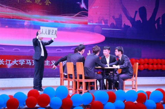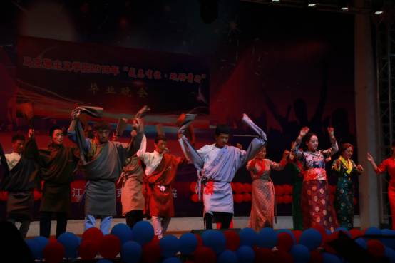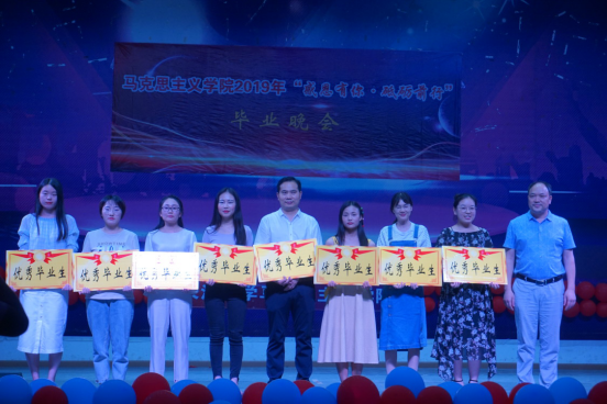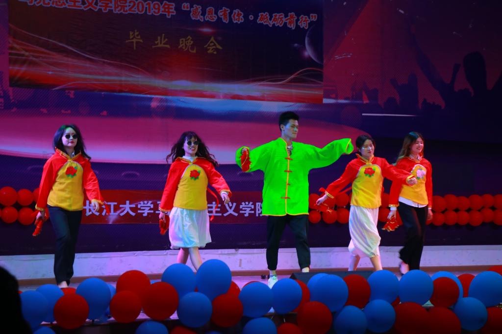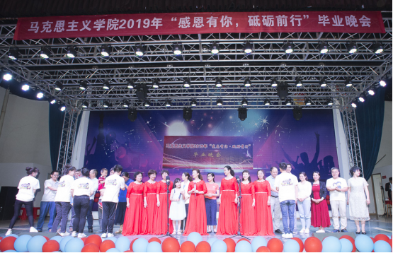 表彰大会结束后,动感火热的开场舞《DALLA DALLA》点燃了毕业晚会。《我的新衣》将现代说唱与传统京剧相融合,使人耳目一新;现代舞《pick me up》、《heart shaker》清纯可爱,活力无限;民族舞《女儿会》、《锅庄风情》柔婉袅娜、质朴潇洒,赢得现场阵阵掌声;歌曲《私奔到月球》、《不为谁而作的歌》温柔甜美、娓娓动听,让人赏心悦耳;《创意T台秀》和相声《我说了算》多元创新、包袱连连,让人忍俊不禁,掌声不断。贾廷秀教授指导的暖课作品《以青春致敬马克思》也再次搬上了毕业晚会的舞台,思政2017级的同学们用话剧的形式展现了青年马克思的雄才伟志,以及他与恩格斯的深厚友谊;肖芬蓉老师的女儿班传珮小朋友也献唱了让人倍感清新流畅的民谣《卢沟谣》;思政11602班的朗诵《不说再见》,追忆了大学时光的点点滴滴,表达了他们对学长学姐的感恩与不舍;毕业班的情景剧《长大,长大,再见》压轴出场,一幕幕情景剧记录了2019届毕业生在长大、在马院难忘的青春岁月,引发了师生强烈共鸣。最后,贾廷秀等7位长江大学教师合唱团的老师们用优美的歌声《闪亮的日子》为毕业生们送来祝福,晚会在全体教师共同演唱的《送别》中落幕。
