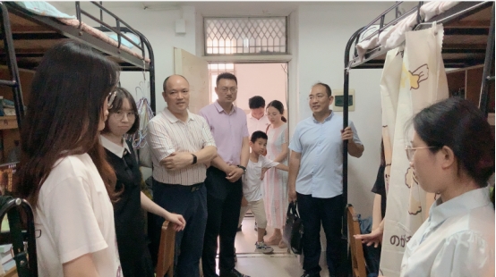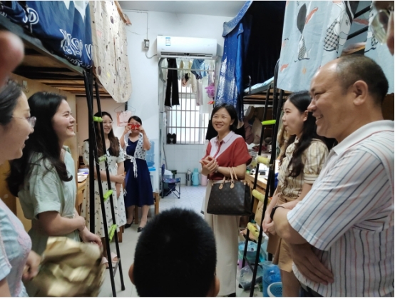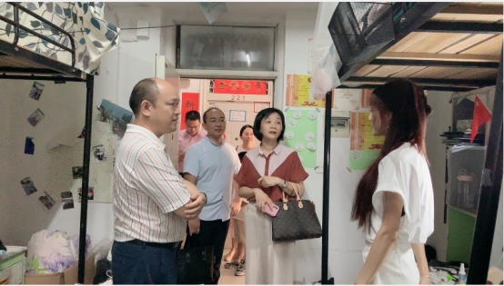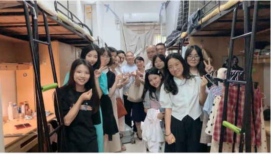 党委书记刘小燕、院长姜学勤、副院长涂江波、院长助理李振华、班主任汤波兰与辅导员张云雾、李敏老师共同走进寝室欢送毕业生。