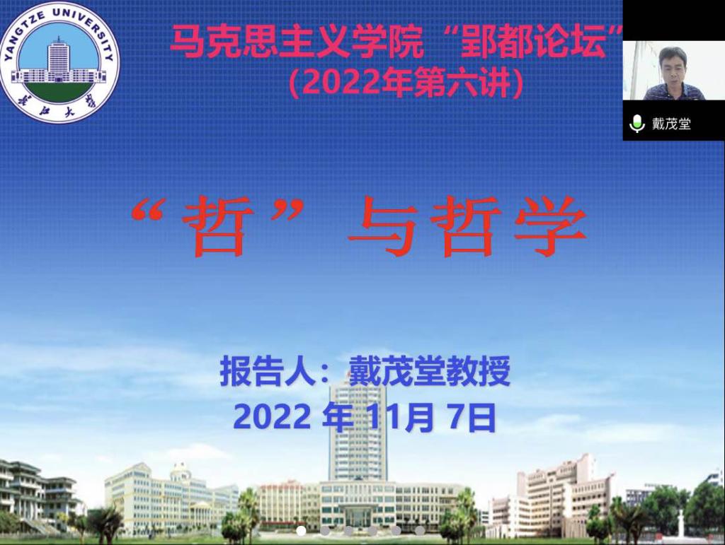 “郢都论坛”2022年第六讲,在文科楼1104会议室和腾讯会议以线上线下相结合的方式同步举行。本次讲座的主讲嘉宾为北京师范大学哲学国际中心的戴茂堂教授,他以“‘哲’与哲学”为主题,深入浅出地解析了哲学的意涵,还原了哲学最本真的内容。讲座由大发娱乐城
