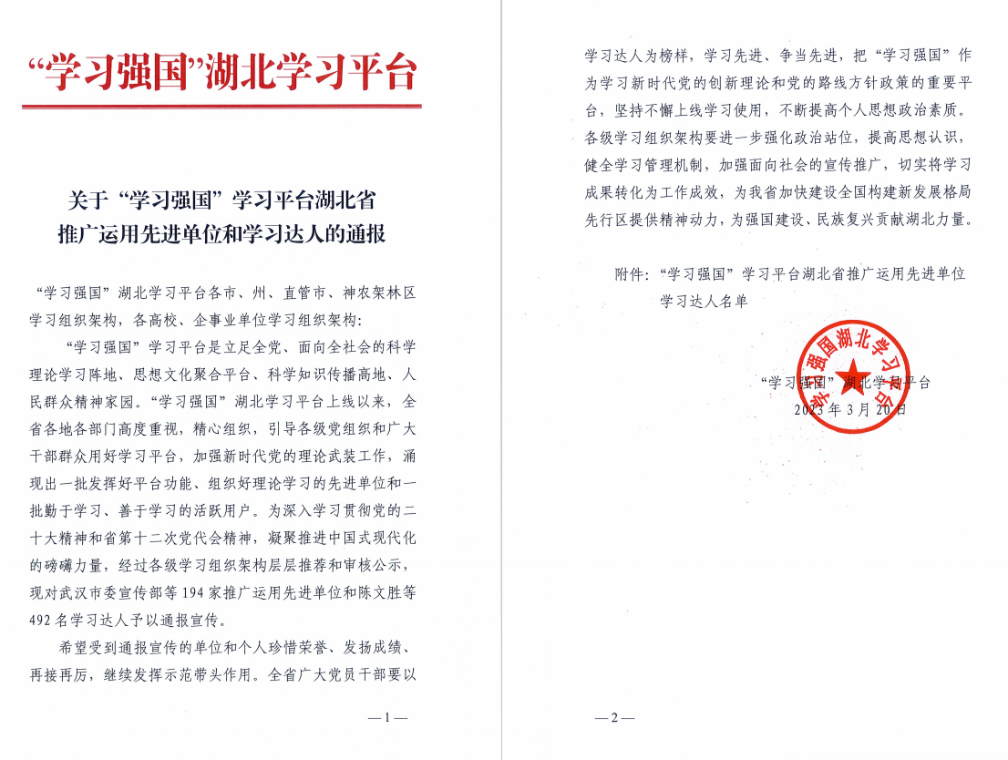 近日,湖北省委宣传部表彰了一批 “学习强国”学习平台推广运用先进单位和学习达人,大发娱乐城 - 大发娱乐城官网入口