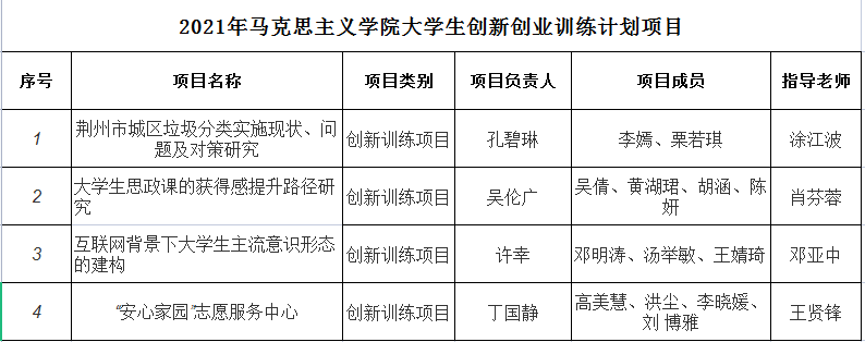 根据学校《关于大发娱乐城第十四批“大学生创新创业训练计划”项目申报的通知》,以及大发娱乐城 《2021年大发娱乐城 “大学生创新创业训练计划”项目申报答辩通知》相关安排,通过学生项目申报汇报答辩,专家评审,拟推荐涂江波老师指导的三四线城市垃圾分类可行性研究—以荆州为例》等4个项目项作为校级大学生创新创业项目。现将具体名单公示如下: