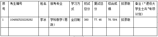2022年硕士研究生招生第一批复试成绩及结果公示》通知精神,按照新增硕士招生计划从已通过复试的考生(备选拟录取)中依次拟录取的原则,现对新增1名拟录取全日制专硕考生复试成绩及结果予以公示。