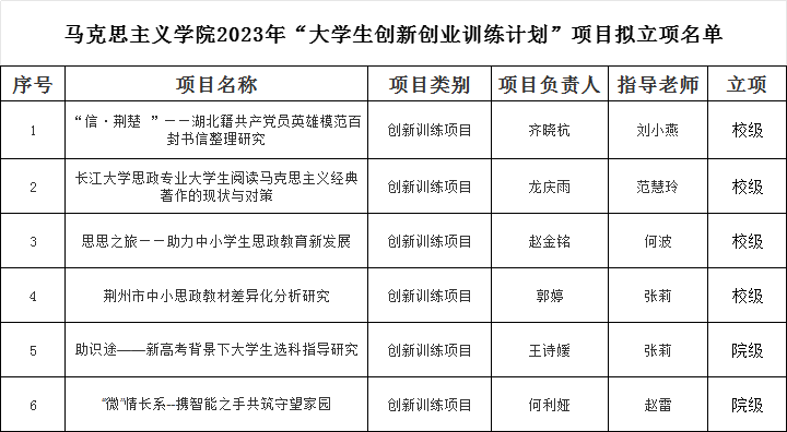 根据学校《关于大发娱乐城第十六批“大学生创新创业训练计划”项目申报的通知》,以及大发娱乐城 《2023年大发娱乐城 “大学生创新创业训练计划”项目申报答辩通知》相关安排,通过学生项目申报汇报答辩,专家评审,拟推荐刘小燕老师指导的《“信·荆楚 ”——湖北籍共产党员英雄模范百封书信整理研究》等4个项目项作为校级大学生创新创业项目,拟推荐张莉老师指导的《助识途——新高考背景下大学生选科指导研究》等2个项目为院级项目。具体名单见附件。