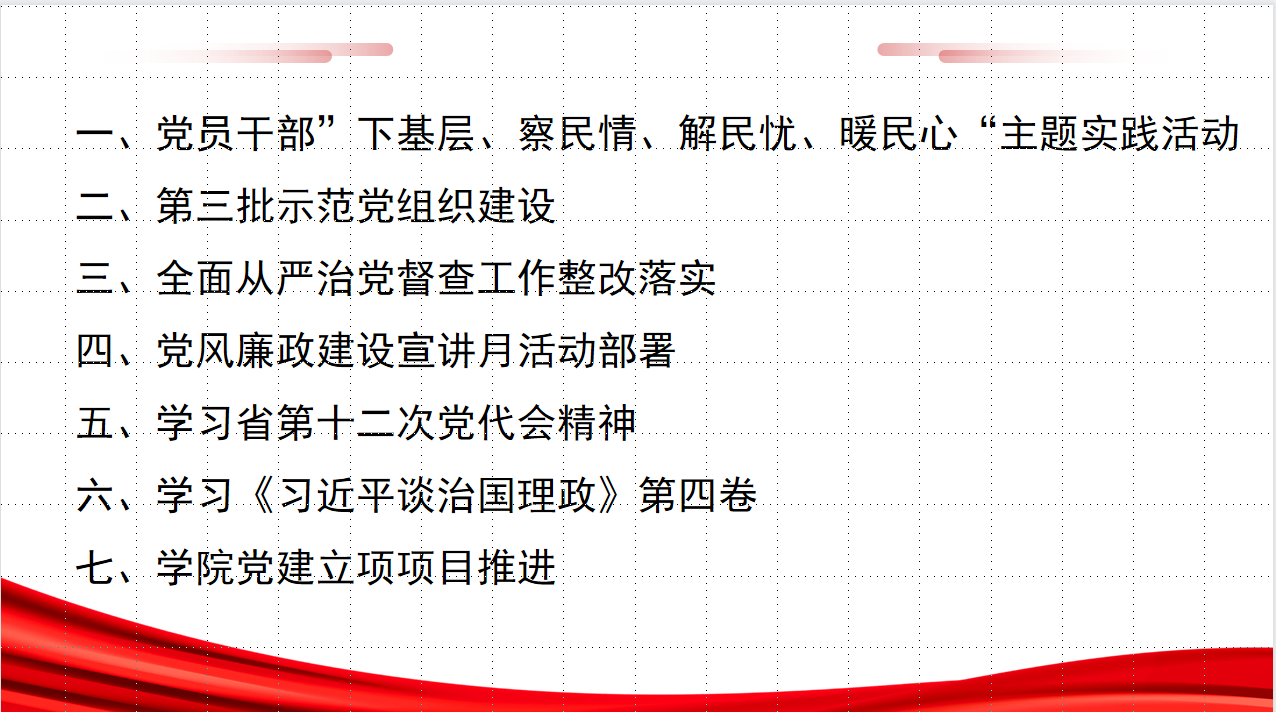 党委申报的“示范分党委”获得建设支持。院党委书记刘小燕部署了下半年党建工作重点,她从组织学习《习近平谈治国理政》第四卷和推进落实省第十二次党代会精神、“示范党组织”建设与党建立项推进、党员干部“下基层察民情解民忧暖民心”实践活动开展、学校2022年党风廉政建设宣传教育月活动落实、长江大学合并组建20周年暨高水平大学建设主题活动实施、全面从严治党督查整改等六个大的方面罗列了46项任务清单。各党支部书记分享了支部工作特色、经验做法和实际成效,认领了工作任务,并进行了表态发言。