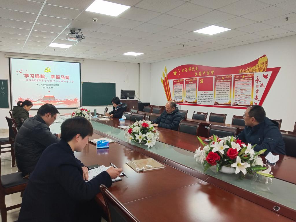 会上,院党委书记刘小燕领学了《习近平总书记在学习贯彻党的二十大精神研讨班开班式上发表重要讲话强调 正确理解和大力推进中国式现代化》、《习近平总书记主持召开中央政治局民主生活会时强调 坚持团结奋斗 贯彻落实好党的二十大重大决策部署》、《继承和发扬党的优良革命传统和作风 弘扬延安精神—习近平总书记带领中共中央政治局常委瞻仰延安革命纪念地时的讲话要点》、《习近平在二十届中央纪委二次全会上发表重要讲话强调 一刻不停推进全面从严治党 保障党的二十大决策部署贯彻落实》等重要会议和讲话精神,传达了2023年全国教育工作会议精神,宣讲了《长江大学关于开展违规吃喝问题专项整治的工作方案》。与会人员还共同学习了《习近平在中共中央政治局第二次集体学习时强调 加快构建新发展格局 增强发展的安全性主动权》、《求是》杂志发表习近平总书记重要文章《全面从严治党探索出依靠党的自我革命跳出历史周期率的成功路径》等内容。
