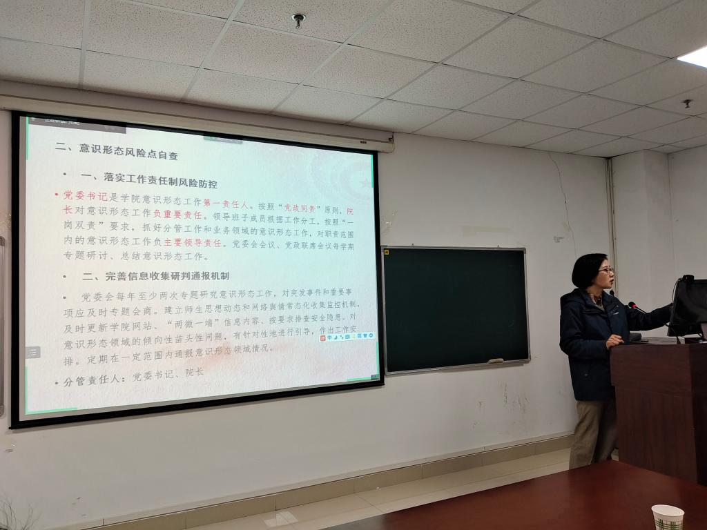 党委副书记马小佼、副院长涂江波,二级机构负责人尹业香、徐骆、张莉、董继祥等老师也围绕学生工作、科研工作、教育教学工作领域的意识形态风险点进行了研讨发言。