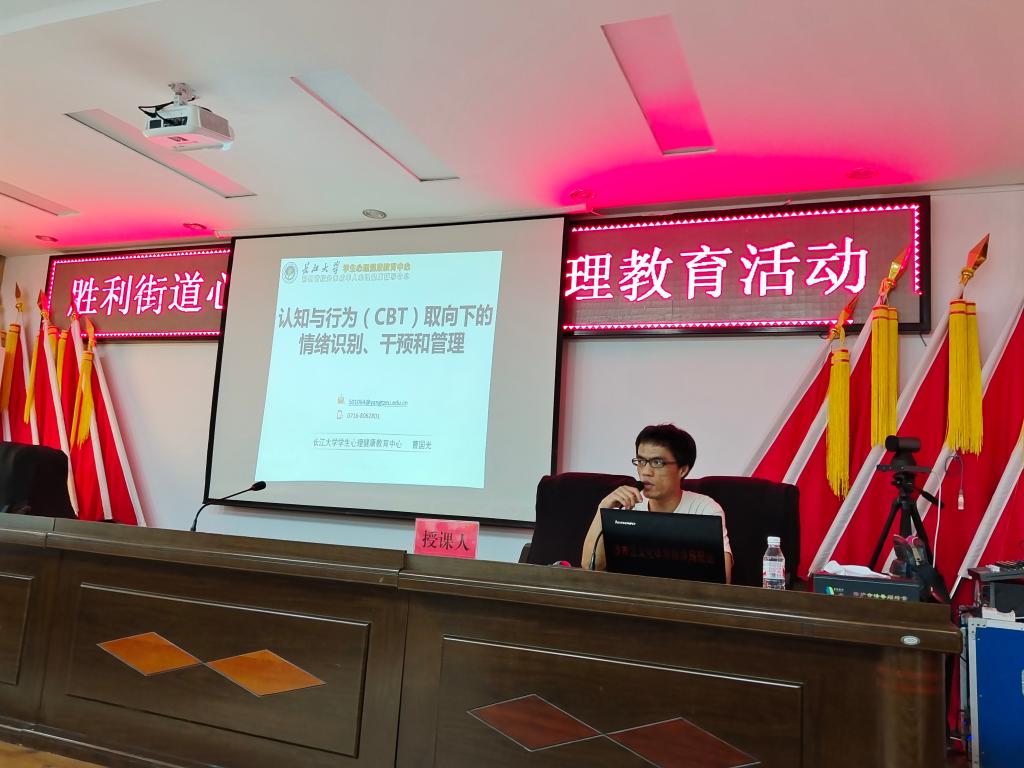 此次培训是由大发娱乐城心理咨询中心专职心理咨询师曹国光受邀主讲。他从认知与行为疗法的工作原理、情绪的识别和命名、认知重建技术、行为改变技术四个方面讲授,课间还带领大家一起做了放松体验,引导学员进行适当的心理调适和压力应对。