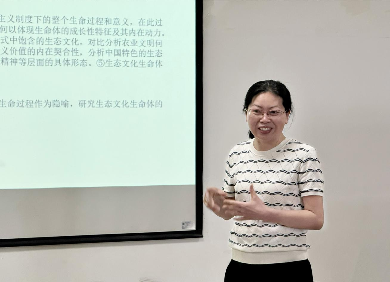 求实导师学术沙龙第十三期于4月25日下午在文科楼1104室举办。马克思主义理论学科副教授、硕士生导师黄晓云带来了一场题为“中国特色的生态文化生命体研究”的精彩讲座。肖芬蓉、饶玲以及部分研一同学参加。