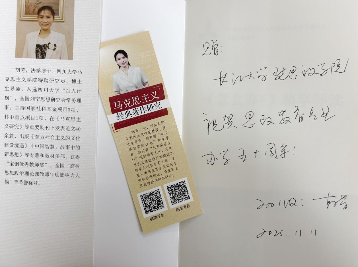 捐赠著作聚焦马克思主义理论、思政课教学实践、中国特色社会主义文化建设等核心领域,是胡芳教授多年学术研究与教学经验的结晶。扉页上“祝贺思政教育专业办学50周年”的题字,饱含对母校的深厚情谊与殷切期许。作为教育部“长江学者奖励计划”青年学者、国家社科基金重大项目首席专家,胡芳教授始终心系母校,此次捐赠为在校师生提供了接触前沿学术成果的优质资源,树立了反哺母校的榜样。