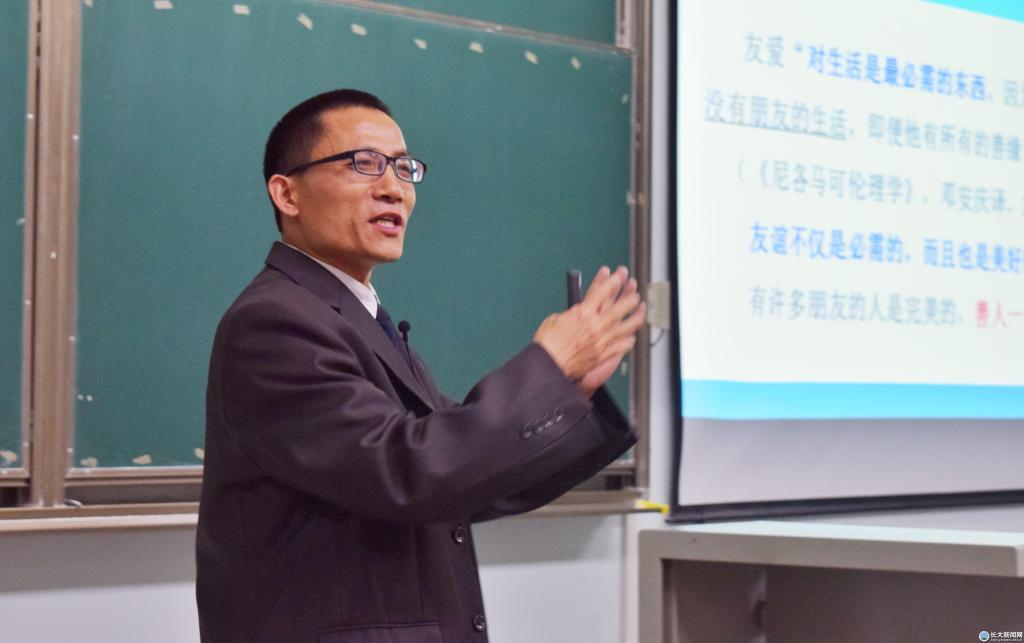 其后,周涛用幽默风趣、充满激情的授课方式对西方文化中亚里士多德的“友爱观”进行了哲理分析。他从友爱对生活是最必需的、友爱是一种德性、友爱需要平等和共同生活、友爱不直接等同于情爱和仁爱、爱人就是爱己、友爱的三个层次,分别基于差等平等的友爱、交友数量等八个方面进行了详细讲解。