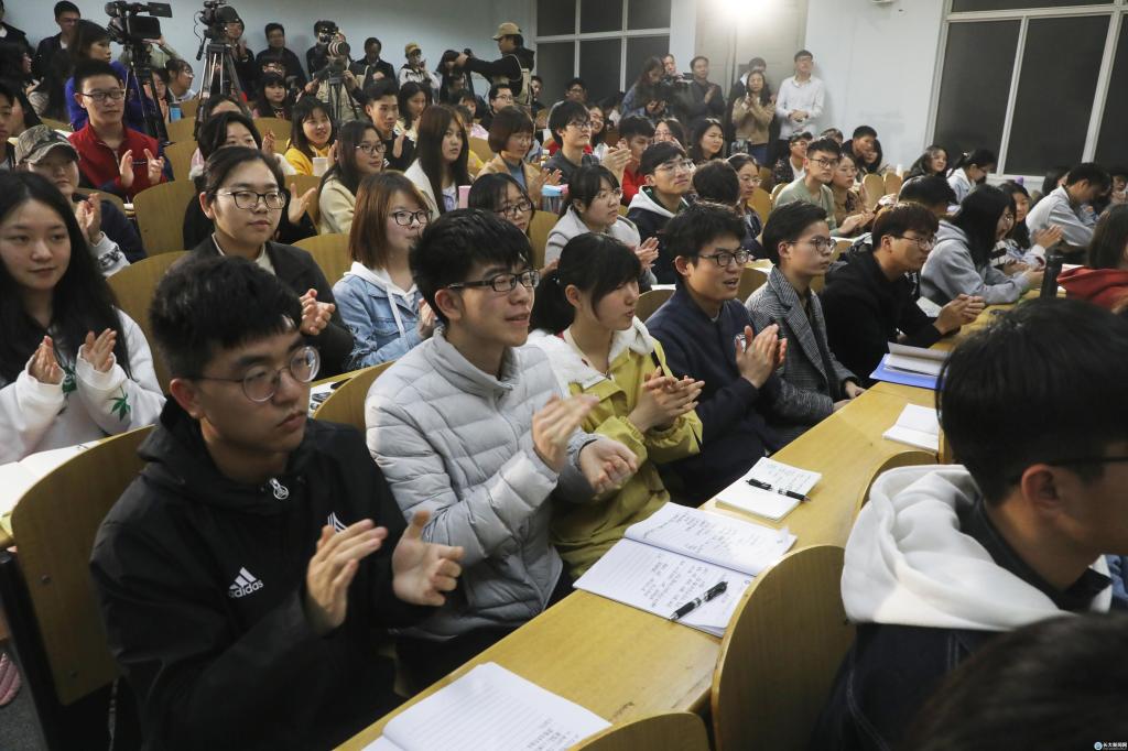晚9时许,203教室响起热烈的掌声,《生命长江》的首堂课圆满落幕。讲授结束前,两位主讲人现场回答了同学们的提问。讲授结束后,两位主讲人还相继接受了荆州电视台记者的专访。