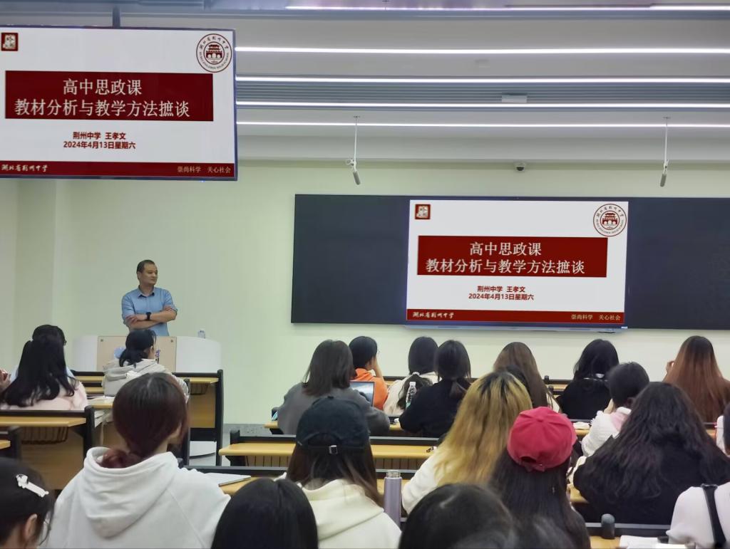 本次讲座主题为“高中思政课教材分析与教学方法摭谈”,王孝文老师以《哲学有点甜》歌曲为导入,表示“高中政治是有味道的”,打破学生对政治学科的刻板印象。并从高中政治学习内容与目标、为什么要学思想政治课、如何教好高中政治三个方面出发,结合自身经验着重讲解五种关键能力与核心素养。他强调,政治课要有味、有为、有效,教学要做到四气:底气、大气、勇气、灵气。讲座过程中,王老师与同学们亲切互动,通过做例题、讨论等,现场演示翻转课堂教学,气氛活跃。