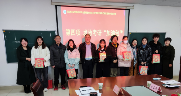 领导老师、优秀校友和低年级同学的声声鼓励暖人心扉。短片结束后,与会老师为考研学子们分发了象征美好寓意的“考研加油包”。