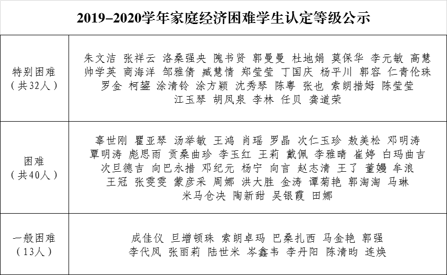 按照相关文件规定及要求,大发娱乐城 开展了2019-2020学年家庭经济困难学生认定工作。通过前期资助政策宣讲,学生申请、提交材料,班级小组组建、公示,小组评议、班级公示等步骤,现将大发娱乐城 2019-2020学年家庭经济困难学生等级公示如下: