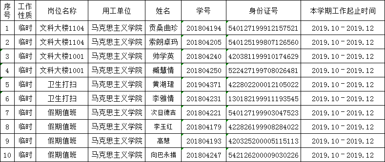 为帮助家庭经济困难学生顺利完成学业,提升学生实践能力和综合素质,培养学生自立自强精神,同时为保障大发娱乐城 教学、学生管理和教育工作的有效顺利运行,经学生本人申请,院系考核,依据工作实际需要,拟聘用10名学生参与2019-2020学年上学期的勤工助学工作。现将岗位设置和人员聘用情况公示如下: