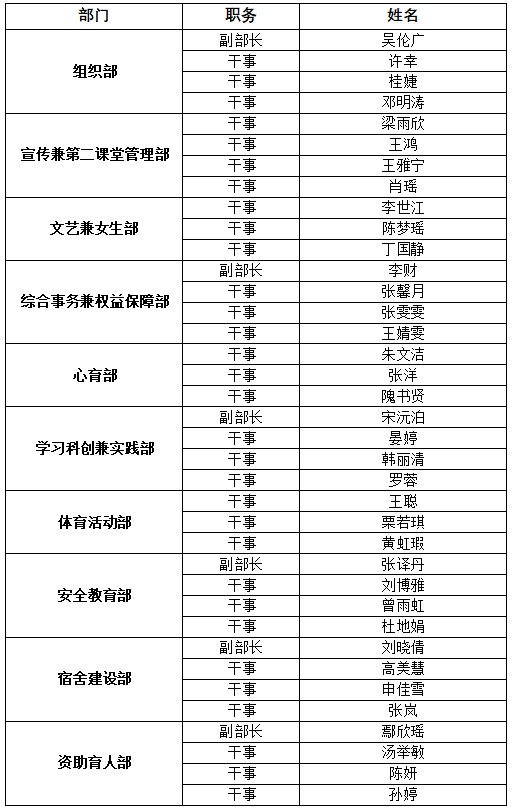 本着公平、公正、公开的原则,经自主申报、资格审查、公开答辩、综合考察等环节,现将大发娱乐城 第八届团委学生会招新竞选结果公示如下: