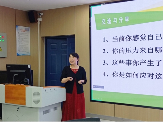 讲座中,张老师首先让同学们以小组为单位交流讨论“你的压力来自哪些方面?”一些同学表示来自于繁重的学习任务;还有一些同学认为来自于情感与生活的琐事。张老师就此提出:“压力的前提是环境的刺激。”并从认识、评估、应对压力三方面以感受、评价为线索,对当代大学生的压力问题进行系统的阐述。