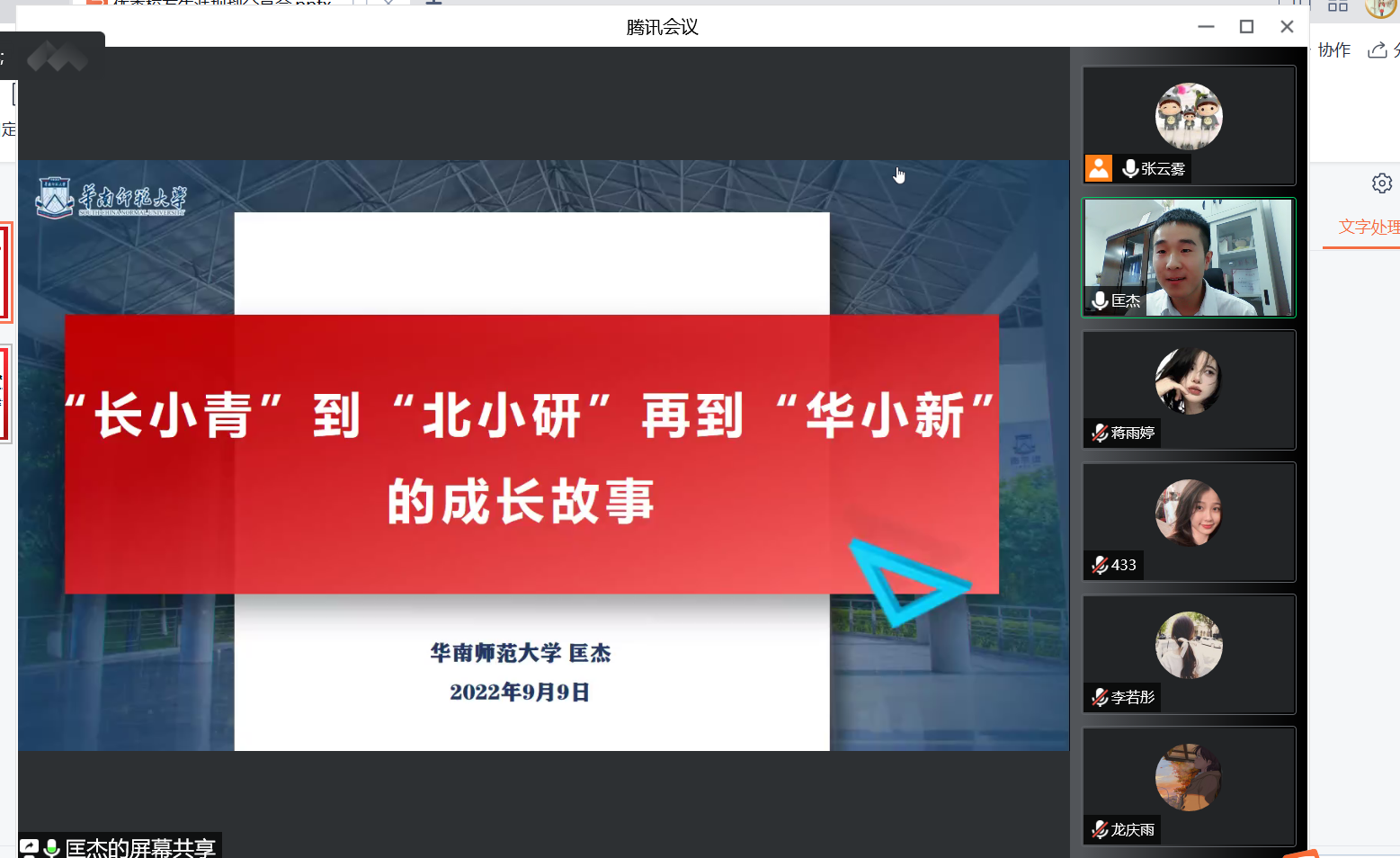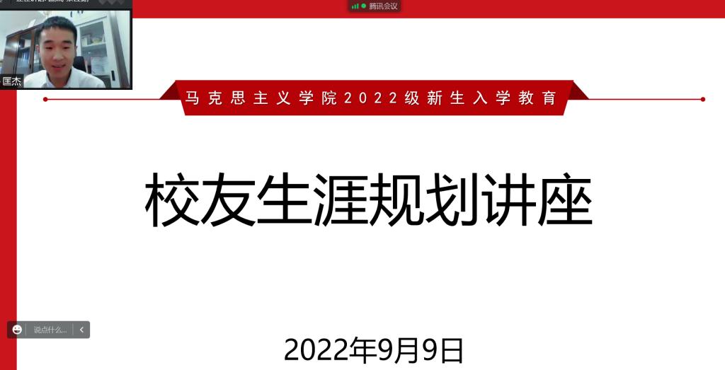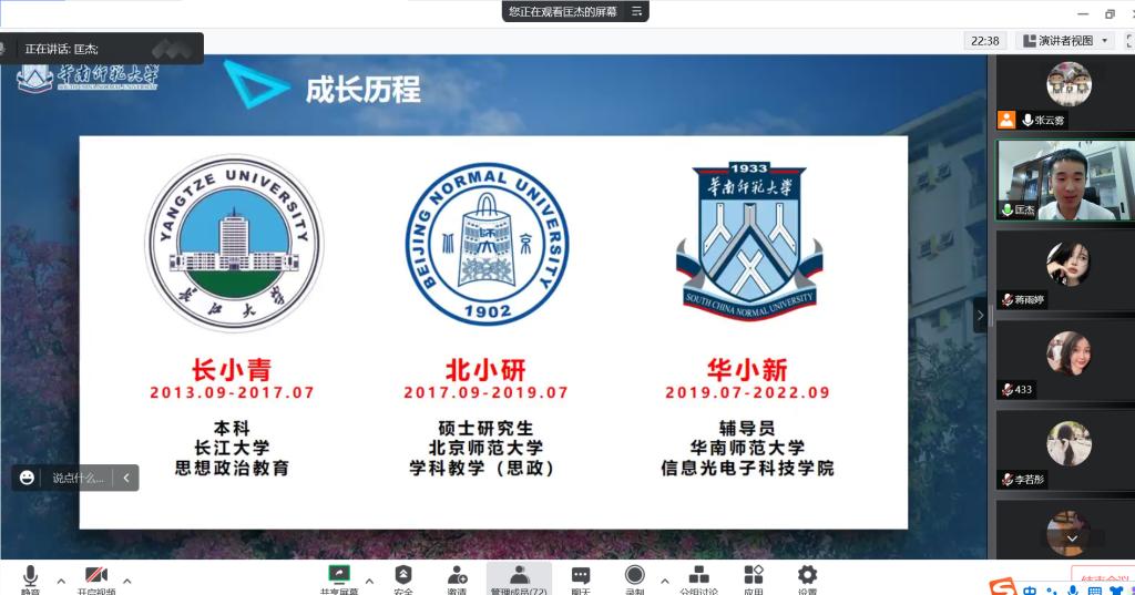 的辅导员。在一个半小时的交流中,匡老师分享了他从“长小青”到“北小研”再到“华小新”的成长故事。他以自身经历勉励新生要善于认识自我,及早定立目标,持之以恒努力,以更加昂扬的姿态融入大学生活,全力以赴向着自己的目标前进。听了他的分享后,新生还意犹未尽,纷纷在线提问,探寻学长成功的秘诀。