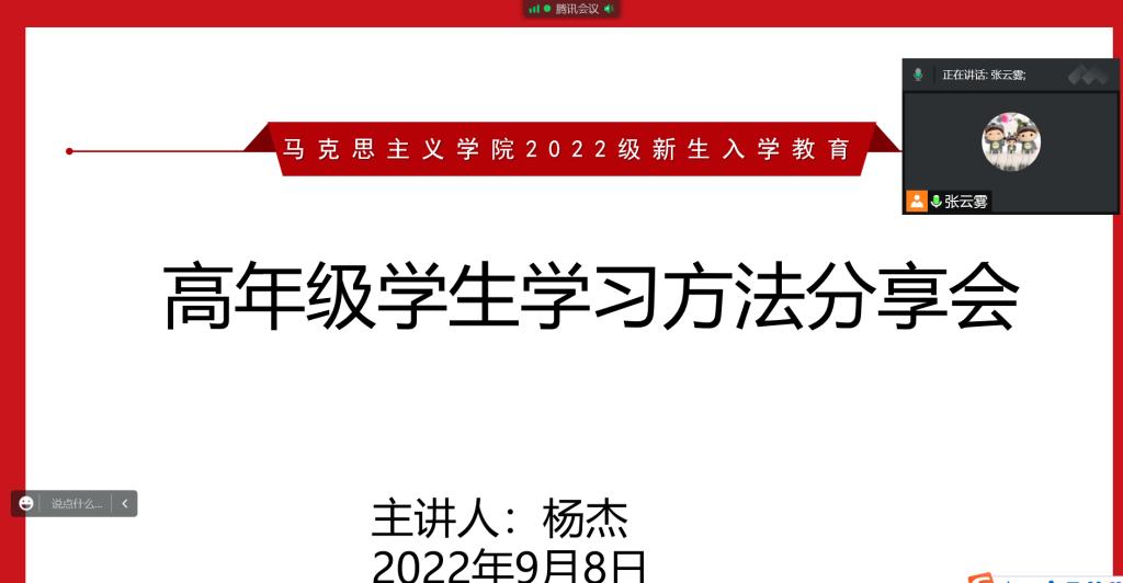 9月8日晚,2021级优秀学生代表杨杰为新生分享了大一期间的学习方法。杨杰同学以学为主,全面发展,各方面都取得了优异的成绩。其中上学年必修课绩点为4.06,排名专业第二,英语四级576分,她担任了班长、院学生会综权部部长,参加了校院各类文体活动,获得了诸多荣誉。在交流分享中,她结合自身学习经历,从学习习惯养成,学习技巧掌握,数学、英语、专业课等不同课程的学习要求进行了深入讲解。分享结束后,学弟学妹们还与她进行了线上交流,进一步探讨了学习方法。