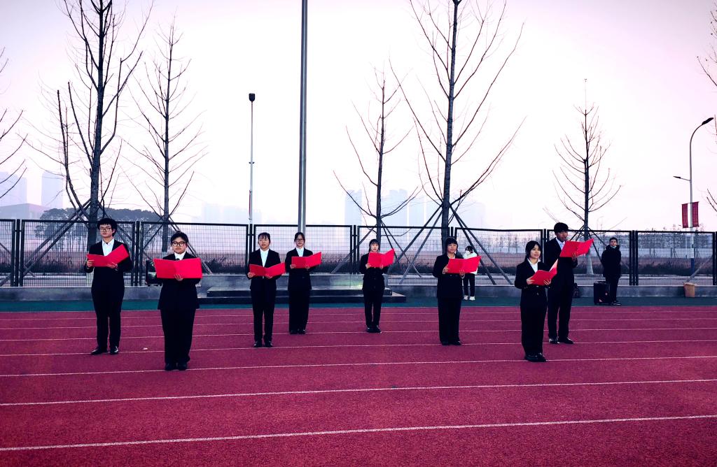 本次升旗仪式的主题为“手握诚信笔,书写人生路”。在齐唱国歌后,由张峻荣等8位同学带来诗朗诵《青春的篇章》。他们认为,青春以爱国为底色,当有星辰大海之理想,当有重任在肩之担当。