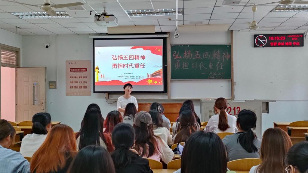 本次主题团日活动采取线上线下相结合的方式,通过理论讲授、视频学习、个人分享、知识问答等环节的互动,引导团员青年在新时代的征程上传承五四精神,以青春之我创造青春之中国。在个人分享环节,思政12202班的王露同学领学了习近平总书记五四青年节对全国广大青年的寄语精神,号召同学们为强国建设、民族复兴伟业贡献青春力量。
