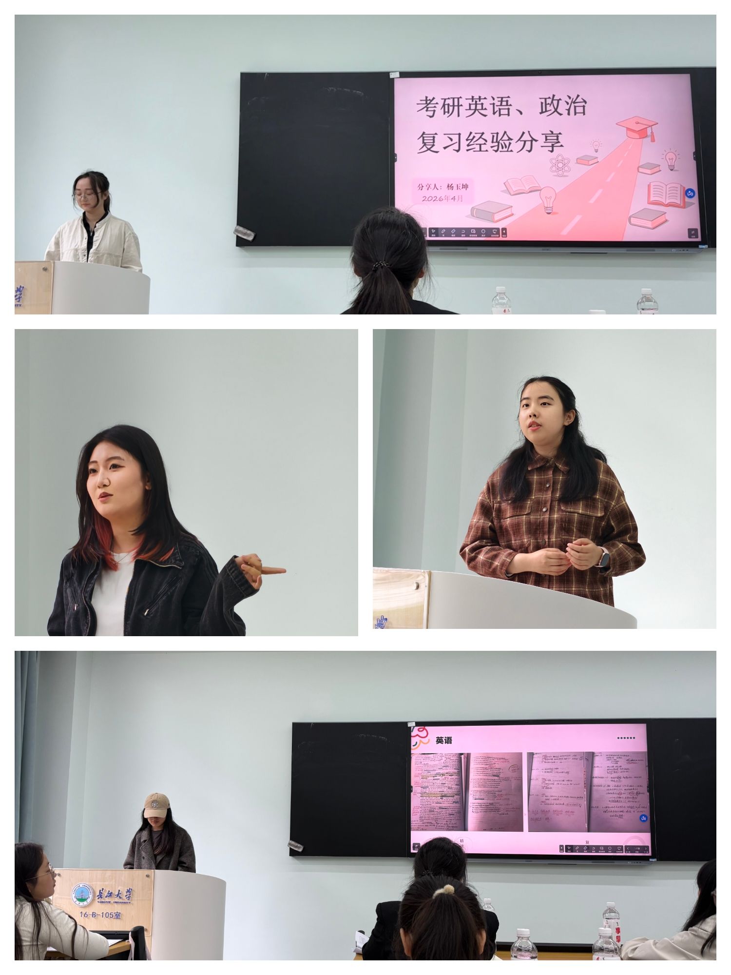 在16教B105室举行2026届毕业生考研经验分享会。活动由学工办主任张云雾主持,温雪婷等考研优秀学生代表分享了备考经验,2023级全体本科生参会。