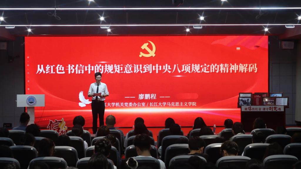 (通讯员文/黎娟 摄/唐佳雨)为进一步推进深入贯彻中央八项规定精神学习教育走深走实,引导青年学子筑牢崇廉尚俭思想根基,培育清正有为时代品格,4月22日晚,《信·荆楚》第二季第六讲《从红色书信中的规矩意识到中央八项规定的精神解码》在东校区16教A313开讲,本次课程由长江大学机关党委办公室主任廖鹏程老师主讲。荆州市委宣传部理论科科长刘立、宣教科科长边飞,大发娱乐城 班子成员、《信·荆楚》课程团队,以及湖北省红色书信研究与传播中心的全体教师与同学们一起聆听了这堂“金句不断、燃爆全场”的思政课。