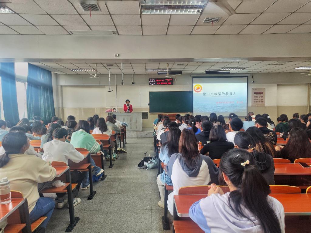 学生做“如何做一个幸福的教书人”讲座。副院长张莉老师主持讲座,全体2022、2023级本科生、2023级二学位本科生参加讲座。