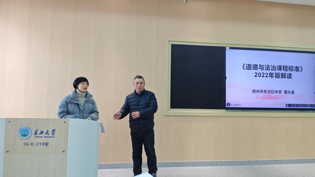 徐骆老师简要介绍了黎老师30余年的教学经历与突出成就,引发同学们热烈期待。黎老师围绕中学思政教育的特点,分析课程标准与教材解读。在课标解读环节,她详细剖析了2022年版道德与法治课程标准的新特点,如落实德育一体化理念、凝练核心素养、实现课程目标综合表达与分学段阐述统一等内容,强调这些变化对中学思政教学的重要指导意义。在教材解读部分,黎老师以初中道德与法治教材为例,深入讲解教材的总体设计、各年级知识脉络以及贯穿其中的社会主义核心价值观教育等要点。为让同学们更好理解,她还结合中考真题,分析知识点在考试中的呈现形式与考查重点,让理论知识与实际应用紧密结合。
